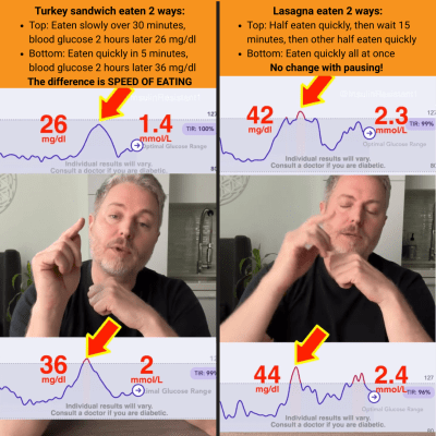In another experiment, he ate half his lasagna quickly then waited 15 minutes and ate the other half quickly. This experiment showed no change in blood sugar levels, so it REALLY is about the speed you are eating.